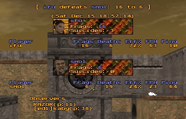 And now the play again in EDL#6. Match was started from ficha's map q2rdm2. I supposed to see the casual ficha's domination and an izi win with a big score, and i have not. Smolensk played very strong, it seemed that he didn't have a ping over 60, he was hitting with rail and chain in his best style, and game was very close. And when ficha proved his advantage in 10 minutes, they started to play for pleasure, and from that time we saw lotta nice frags and hits. After all, i found that game very interesting.