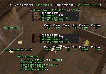 q2dm3 was accidentally played with timelimit 20, due to server complications. At the 15:00 mark sofiene was in the lead, but at the 20:00 mark newash won. The game should have been aborted straight away, and restarted with timelimit 15, but since neither player made this happen, the game is now considered sofiene's win. However, if either player wishes, he may demand to have this map replayed altogether.