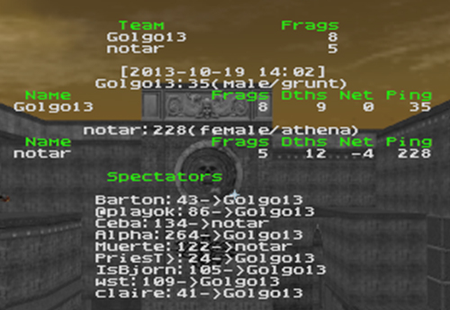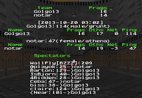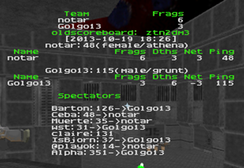 Golgo13 picked q2rdm2, notar_1 - ztn2dm3 Golgo13 kicked koldduel1, q2dm7. This was home away game. Scores after 2 maps were tied. Notar won blaster fight. /Ceba