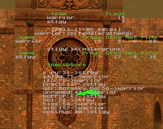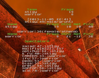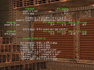 ----------------------------------------------------------------------- st1gmata did not upload demos. According to rules 3.3.4, 3.4.1, 3.4.2 and 6.2.6 he receives 1 warnings. /Ceba ------------------------------ warrior was kicked out on 2014/1/13 for reaching and significantly exceeding the warning limit for their division. All their games turn into walkovers. /claire