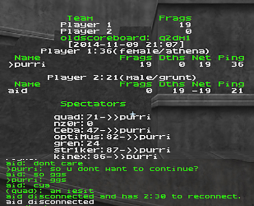 -------------------- Played AiD picked q2duel5 PURRI picked q2dm1 Aid disconnected during q2dm1. He receives 1 warning and -75 frags (rule 4.3.1) Previous warning are reduced to 1. /Ceba