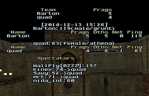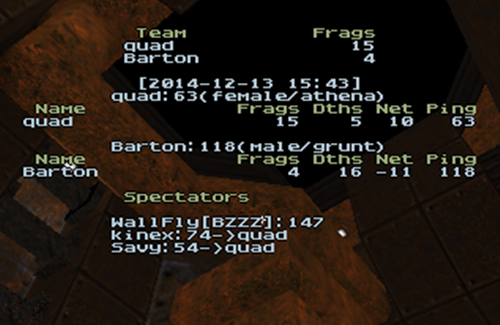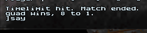 I picked q2rdm2 for my map while Quad picked koldduel1. There was a double OT on the q2rdm2, which I ended up winning. It was a very close map the whole game. Quad easily won koldduel1. He had superior item control, especially with the mega health. After the first two maps, Quad won the frag difference and he chose q2dm1 for the third map, after we kicked maps. I ended up losing q2dm1. I think near the end I finally got real map control back but it was too late. Next, we played ztn2dm3 for the fourth map, which I ended up winning. The map played out like q2dm1 but for Quad, where he had some potential to comeback, however he didn't have enough time. After all of those maps, the match score was tied at 2-2. Since Quad had the higher frag difference after the third and fourth map, he chose ztn2dm2. Quad won the last map, thus he wins our match up. My strategy was not so good on the last map since Quad kept my health super low (15-45) for a very long time. That prevented me from being able to properly time RL and be able to challenge for it. Thus I tried to play mostly railgun but I couldn't hit important railgun shots during that map for some reason.