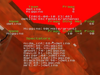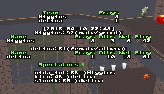 Good games. This was a close set. koldduel1 was a very, very close map. Some of us in spec mode during the match thought that Higgins could of won koldduel1 when he was up two frags with less than two minutes left, if he played more defensively. Though it seems on ztn2dm3 the match eventually turned into detina's favor when he started to do more consistent damage with railgun while controlling red armor. Higgins played good in this match, especially for his high ping. Also, his rocket launcher was quite effective and I think that helped him dominant when he was doing well in this match.