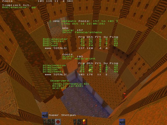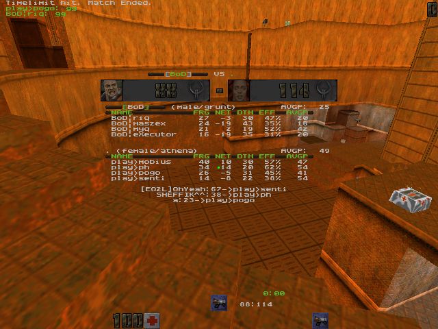 q2dm2 - BoD's map BoD made an amazing comeback with this map, pretty much crushed play's hopes of a 2:0 victory. From the first seconds they took the lead and it steadily grew. BoD managed to time quad extremely well and in addition they managed to get plenty of RAs too.