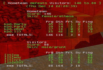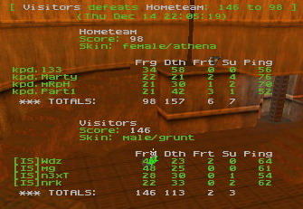 Next map was dm1. It started out even too, kpd was holding lift and room, while IS was railing. As expected when to pretty evenly matched clans clash on dm1 game will be pretty chaotic. Game was tied after 5min and pretty much no one had control over any place longer than a minute. Or IS kind of had pretty good control at rail, but it seems that good old room camp still have some power left. I was hoping that kpd could hold room to keep this game even if not then ISs railers will take over the map and game would turn to pretty onesided. Score after 11min was 68-56 for IS, thanks to wdz who have done nice job at rail. Little by little IS was increasing their lead, after 15min it has gone to 20frags. And after 15min mark railing continued and lead was getting bigger. Last 3-5 minutes were totally dominated by IS. And in the end their lead was 146-98. motm wdz, even tho he said bg after the map!