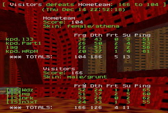 But to get some good you need to suffer some. Next it was time for dm3! Parti got the first quad but died fast. Then he got 2nd chance to get powerups when he picked up RL and invu was still waiting its taker. Too bad for him he failed in RL-jump, and after that his teammate killed him with grenade. So invu went to wdz, whose invu run allowed IS to take next quads. IS had early 10 frags lead. After that game evened up. kpd was holding rail and did pretty good job at quad too, if they didn't get the quad they at least killed it right after it was taken. 5min left and it was invu time again! Let's see who is getting it. Without any fight from IS, it was kpd and mrph who got it, but while he was camping there IS lead was back up to 10. mrph cleared rail with invu, but he couldn't stop IS to take next quad. First I though his invu run was pretty weak but during next minute he showed he did a right choise. After invu was expired he railed kpd back to the game, actually he almost tied a game when it was 8 min left. Another player who did something worth to mention was mg, who first railed few kpd guys away from quad, and then took it him self and cleared whole map. That gave spawnfrags to IS and their lead was growing. When 3rd invu spawed, IS had 25 frags lead. Also that invu was taken by IS.