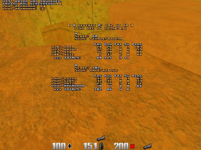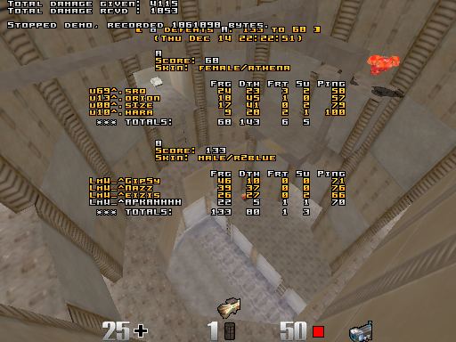 Hah that was the funniest game that i have ever played First of all, dm5- it was u^ map, and i thought they will fight hard here. BUt.... these guys didnt even know where is RA + chaingun because in 20 min there was 4 attempts to retake that possition. (quaders scored all my deaths). All 10 (!) frags were made by catching spawning in RA area. However, interesting. dm2- yep RA lift is least important. Only few attempts to retake lift ( any rocket jump to ra, any teamjumps ) dm3- i just can't imagine what it would be if in my place were played rmx.... I suck with ssg but still i got 46 frags near ssg/quad. The main fact is that u^ team's all members(4) mostly were camping near quad. As always, a bit shit that some of u^ members got a bit lagged sometimes. Sometimes they just didnt move (wc etc i dont know that mean for real i dont care)