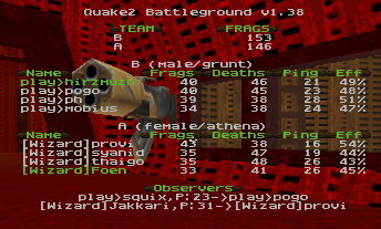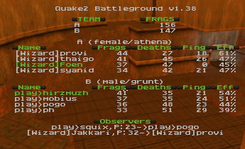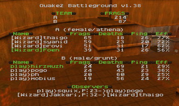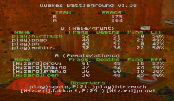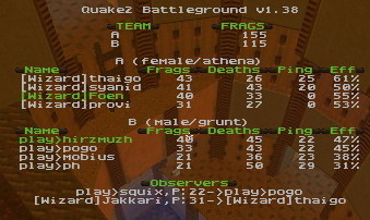 Q2DM1So the first map began and there was a little mess in the beginning. No team seemed to dominate neither water nor megaroom. Only thaigo managed to raise him out of other players. Then little by little Wizards managed to get steady control and in the middle of the game the score was already +60 for them. Next followed quite a rape from Wizards. They played nice teamplay, thaigo and syanid also showing good statistics. Provi had some problem on the rail but it was a good warm up for him. On the other camp hirzmuzh was trying his "attack a lot-die alot" tactics, pogo seemed to be trying to outsmart Wizards, but ph and mobius were kind of asleep and the teamplay didn't work out well. So after the first map Wizards showed they were really determined to win.