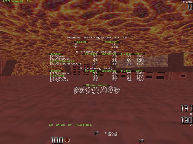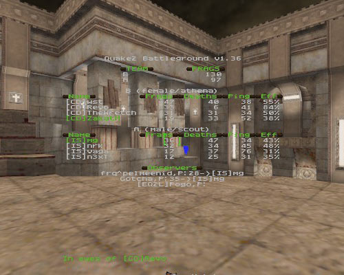 dm3(CD's map): This map started off quite equal with inv for is and quad for cd. CD had quad area under control while IS focused on rail. The map was really close with no team getting more than 10 frags ahead. Second inv went to cd and third to IS. By the time the last invul was about to spawn the game was tied! IS was camping invul waiting for it to spawn, but somehow CD managed to jump up and kill him at the EXACT same moment the invul spawned. This seemed to really take away the hope for IS who now looked completely lost and got spawnraped all over the map by CD railers. Map ended 171-130 to CD