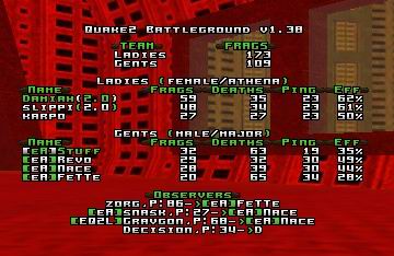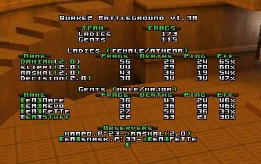 Q2DM1 - 2.0's map The game started pretty even with eA getting the first rails and 2.0 taking the Mega Room. During the first 10 minutes, 2.0 had the lead but the eA guys were fighting hard with a very agressive style. Damiah was gathering many frags everywhere on the map for his team (2.0) as usual while fette and Revo from eA were trying to keep control of the Rail to attack Room. Nace caused many problems to the 2.0 Room keepers with a couple of well landed rockets and SSG shots. Overall, 2.0 played more carefully than eA and avoid many stupid deaths. eA's coordination wasn't at its best and Stuff had quite a hard time on this map. 2.0 claimed the victory on this first map. Q2DM3 - eA's map This map started better for eA, they took the first quads and the first invul (afaik) and actually eA kept the control of the whole SSG place most of the time. Unfortunately for them, 2.0 did the same with the Rail area with Raskal who didn't frag that much but still never let the Rail to the eA guys. Thanks to all their rails, 2.0 managed to steal many quads and of course respawn-fragged eA like hell. There again, I think eA's major flaw was their coordination and team communication. They made many teamkills and sometimes they seemed a bit lost. Conclusion:It brought me back some good memories to see a 2.0 - eA match and especially with guys like fette and nace playing. I think eA still need some practice to get their teamplay back on track and 2.0 proved again that experience + skill + Damiah = deadly combo.