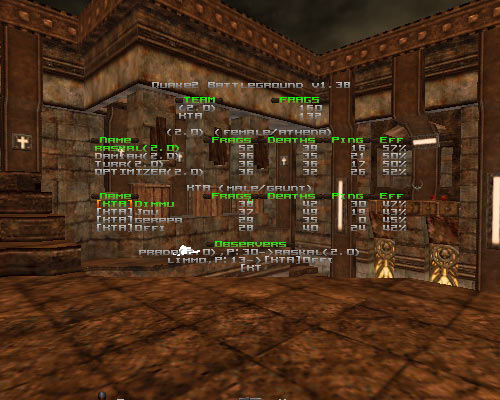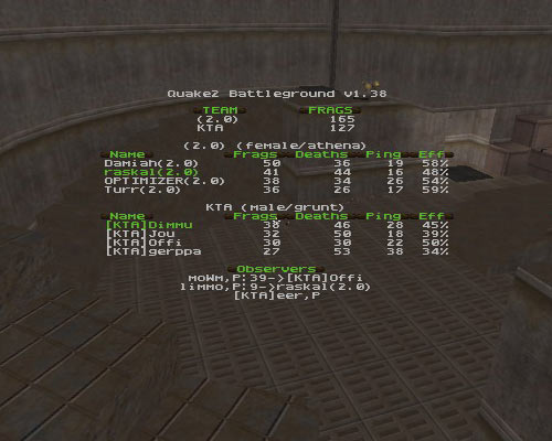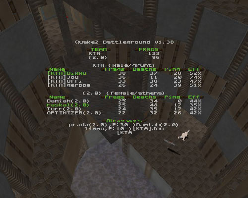First map to be played was dm1, 2.0's first mappick. The map started good for kta with a control of megaroom for the first minutes and they took a +10 fraglead. 2.0 managed to take back control over room after 3 minutes by some nice kills from damiah. Raskal was playing rail but he couldnt hold it for a long time because dimmu and offi were attacking it alot. Damiah and optimizer was controlling megaroom really good sometimes in the game but it never lasted for long. When they lost it they were fast back attacking with hyperblaster and the weapons they could find and shot down the kta players to very low health. Some seconds later 2.0 got the room back in their hands again. Turricane was playing lift and he did a pretty good job there except one time when he spawnkilled raskal 2 times in a row at the spawn above chain=). 2.0 managed to get more frags then kta did when they had control over mega and rail and therefor they won this map. Man of the map was Damiah with some really nice railing.