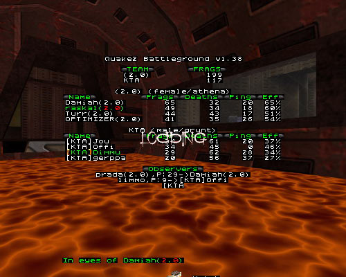 Third map was 2.0's second mappick dm3. First invul was taken by dimmu but he only found the quadguy which was taken by a 2.0 player and killed him. When the penta was over was the score even 7-7. Second quad was taken by damiah and it was a pretty good quad run and 2.0 took a +10 fraglead. Also the third quad was taken by damiah but he couldnt do as much damage as he did the quad before but he killed a few enemys and the lead was now +20 in favour of 2.0. The second invul was taken by damiah while dimmu took the quad for kta. The teams was just switching frags next minutes and the score was still +20 frags for 2.0 after 7 minutes. Damiah and optimizer was controlling ssg area most of the time on this map and could therefor win the map with more then 80 frags. Man of the map was damiah with some really nice quadruns and nice aim.