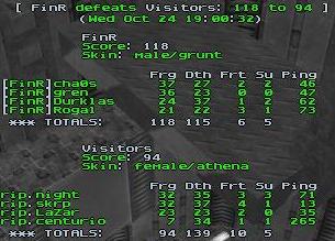 last match we played on mhs server because we havent italians servers upgraded to r1q2... but this time the italians servers were ok and Finr won t play on it both matchs and on Dediz we had many problems... The server disconnected me for many pl... (and i got pl for all the match...) The ours 4th players night had ping 130 and he quitted at half match. This isn t fair play GG FINR