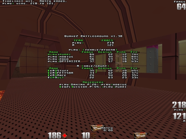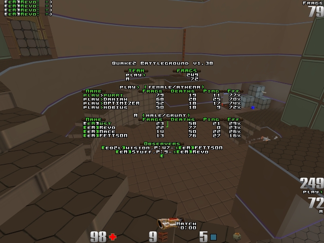 The next map was The Frag Pipe, home map of eA. Though you reall can't call it your homemap when you play against purri and Pogo there. Anyway eA had one of the best quadkeepers there, Nace, so they might had had a chance. In the end it turned out they didn't. Again quite a rape by play. Especially on rail, which was owned by purri. In quad area play had some problems since eA sometimes tried to get all four players there. Again top scorer was purri, then mobius, who played solidly, and the Frag Pipe master Pogo. Optimizer this time was some kind of a weak link. In eA Stuff emerged with best scores, trying to play smart, guarding invulnerability and so on. Others where more or less attacking, dieing, attacking, dieing...