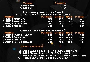 [BAM]Blood almost dodged [HBQ]wision's rocket [BAM]Papa Doc was blown away by [HBQ]arch's super shotgun [BAM]Killzone was blown away by [HBQ]wision's super shotgun [BAM]Quang was blown away by [HBQ]arch's super shotgun [BAM]Blood was blown away by [HBQ]arch's super shotgun [HBQ]necro was popped by [BAM]Papa Doc's grenade Timelimit hit. Match ended. Ladies wins, 133 to 132.