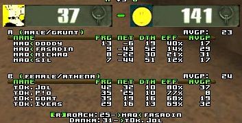 dm2 started with tok ra controll. So they played it from there. 20 minutes of RA posesion. maq had quad most of the time, defended it quite well, performed nice attacks on RA and seemed to be doing everything right, but never could make a 'finishing him' on ra lift. tok changed their lifter from time to time. Huge score by Ivers was made under RA where he spawnraped for the whole game not allowing maq to cut the lift-supply-line. Again nice safe teamplay here by tok.