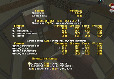 But on dm3 we see a classical scheme from muffzors: 3 quad 1 rail. I am having a mixed feeling after watching that game. Muffzors lost 3 invulnerabilities, gave away almost a half of quads with an overal control of quad area, didn't have any decent control of the railgun... and still DM-the-railer got the most frags/net , muffzors win with +50%. The only logical explanation is that maq was really heavy on fraging while muffzors don't need any positions or powerups to shoot out the oponent.