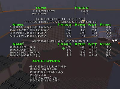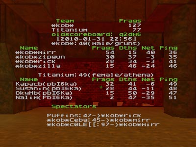 q2dm3 was picked by kob. First 10 minutes kob stayed at quad and ribki were gathering at rail. The game was fairly even untill 10 minute when sides switched and kob got controll of the railgun. During 5 minutes they managed to 'rail' a leap forward. 2 last quadruns by ribka almost evened up the score, but it wasn't enough to win. A key point to kob's victory was grabbing all 4 Invulnerabilities (3 by mirr)