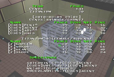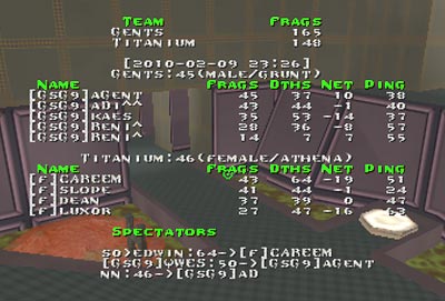 dm8: first ps killed instantly, then a series of megas and several red armors grabbed by GsG9, which allowed them to keep track on powerups timing while folk could only wonder when the next powerup will spawn. GsG9 mostly held the rail area but were sometimes thrown down by folks attacks, never the less GsG9 were always there to pick next powerup. Eventually it resulted in securing several power shields and distributing them among GsG9 players and the score, mostly even untill then, started increasing dramatically in GsG9 favour. A huge part of it made Reni^ who got his PS on 12 miute and completely locked down YA/Hyper area thus starving folks and providing his team vital cells, nice assists and a lot of spawnfrags. Imho, folks showed very nice aim, but lacked the GsG9 teamplay on this map...