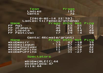 dm6 started with a similar rape. Minute 4 and kob were still with 0 frags. At around 8-th minute kob finaly managed to break the damned circle and steal a quad, then another. No quadrun came out of it but FF were a little cought by surprise with such an upising. Unfortunately for kob, FF was too strong for kob to take over the game, though their attacks started to result in temporary posesion of either rail or bfg. Still this was not enough to deny Ag3 (nicely assisted by d1abell) from quadrunning. 5 minutes till the end kob managed to make 2 decent quad grabs converted into nice pack of frags but FF was already unreachable.