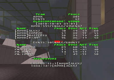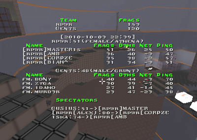dm1 by fun masters: Very agressive play from the very start by fm. rpwr was clearly not ready for such a pressure. They survived through the map only with constant regrouping at rail. The frag gap was constantly very narrow but in rPWR favour. Only during last 2 minutes russians managed to take over and increase the lead to 33 frags.