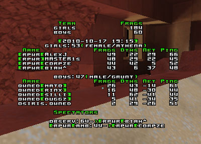 [qwned] q2dm2: qwned got RA from the start and controlled the quad area. Only corpze was really into the game under RA with a chaingun not letting any1 on the lift. Then at soem point I(biah) got controll of RL lift, first killed a quad then provided AlexJ with one. Unlucky jump to RA by qwned, a well timed quad ssg shot from AlexJ and [rpwr] takes RA. Several attempts to quickly regain RA by qwned failed, [amb] and corpze were able to eat themselves and take all neccesary devices also providing AlexJ with armor and guns. After that qwned could not really concentrate getting raped under lifts and unable to really secure quad. Finishing the job was easy for [rpwr].