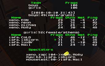 Best map, best fight, veryyyyy close game and some dramatic finish by Xeno :> Ra and below, close fight between Neon/Moby vs Isbjorn/Cold. At quad we could see michaq jumping around mgh/ssg/quad and eon who had to support him. IAFA couldnt keep these positions for too long, even if Michaq wasnt on time totake quad, eon did the job, by taking or killing an enemy quad.Almost all the time a score was about +10 for Xeno, but, eon/michaq decided to make it harder for thei team and IAFA took control over the last few quads....... 2 minutes left and we got a hold.....+6 frags for Xeno but quad is going to be for IAFA, michaq disconnected....(he forgot to charge a battery in his laptop :D ). 3..2...1 here we go again, 5 .....4 ......3.....4......3.....2.... frags difference !! 30 seconds ! last quad for IAFA ! +3 +4 someone jumps on RA lift and killing one of the Xenos ! 1 frag only now, 5 seconds 4, 3 ,2 +2 for Xeno, Neon did a job and used his RL very well. Boom. times up. GG 108-106. Interesting game but i think we can expect much much more from both clans. GG