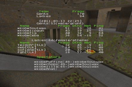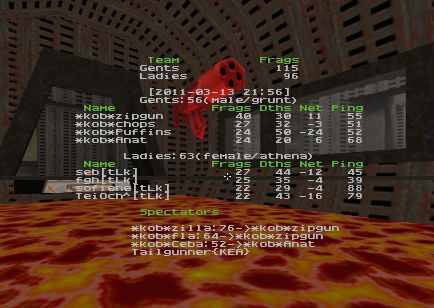 Close first game but Kob won Kob took control of ra on dm7 and held it with soulwax doing an amazing job on top with rl , wp both teams a joy to watch no bitching just some good ol oldskool q2