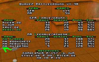 I watched q2dm1 demo and the game was really close for 15 minutes then Germany had rails and secured the MH and lift, they started fragging more and win.