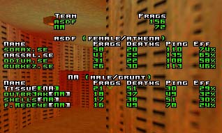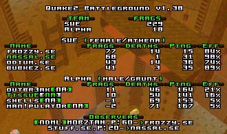 Game started with SWE-s map on NA-s server were Swedish players pinged around 130 :) anyway they managed to play very nice, speccially sorax @ railarena <- showed us some very nice railgun handling with 130 ping. So sweden managed to win the map with quite big frag dif. gg :)