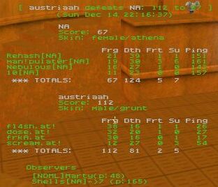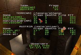 NA picked q2dm1 , so i was expecting big ownage from AUT due to their low pings. But NA played suprisely well, they were concetraing main on lift and mega, leaving rail to austria totally. With the power of rocket launchers NA holded score 20 frags behind austria. Only in the end flash and frika shucked out of rail and fragged more than before. Final score 112:67 for low ping team.