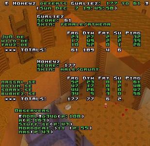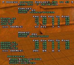 As always Sweden picked their best map - dm1. They could have picked a map they don't play so well to practise against weeker oponents, but it was their choice... As I expected Germany wasn't very hard to cope with. All swedes had 40%+ rail accuracy and never gave megaroom control away. I think the score would have been just bigger if sorax had shown his mad skillz at rail area. That night he had some problems there...