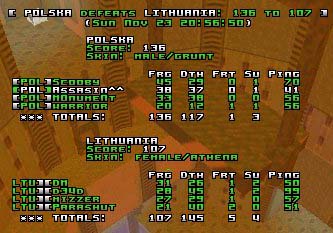 The game started in Poland's favour,with Scooby having the first quad and Assasin controling the RA-lift. Poland tooled up at RA and began to frag, but Lithuania made a nice base at quad and started to frag back... After 7minutes, when the score was 41-23 for Poland, Lithuania took the quad and managed to take over the RA-lift. They didn't hold it for long tho, because the Polish players, tooled up with armor and rails didn't leave them a chance to get a serious grip on it.When the game was half played (10minutes left),suddenly 3 Lithuanian players (Parashut,DM and WD) overflowed and disconnected.