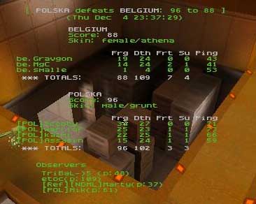 Belgium had very bad start, they were losing maybe by 30 frags after first 5 minutes. After that smalle and magic tried to carefully attack mega from lift. Poland was owning rail arena with deadly rails. They give up lift to Gravgon who did not have much chances to frag any pol players because Poland bet on their best gun - rail. Poland played tacs 2 railer, 2 mega campers and they managed it very well.
