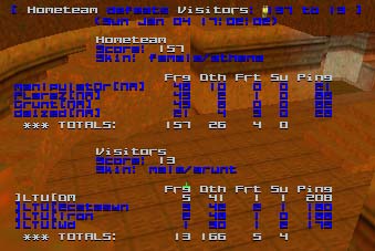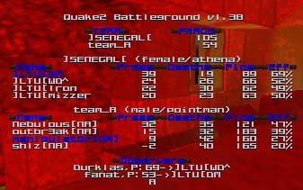 NA chose Q2DM5, kind of a foolish map selection, it has quad and when you ping 200 on the server you chose the map on... you want little powerups as possible. Lithuania had total quad control. With that they were able to easily rack up the frags to give them a +151 frag lead. DM played an exceptional game scoring a 53-4.