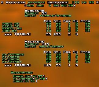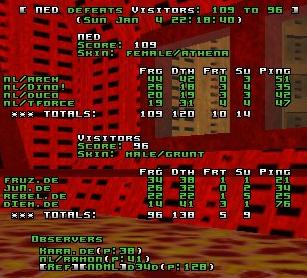As on dm1 so on next home map, dm3, Netherlands couldn't find their gave for very long time. Germands owned every quad and invuls in the beggining. They showed good teamplay and left no chances for netherlands to get even a frag. Only arch was wise enough to use some brain and not just attack frantically. With time all netherlanders woke up again as on dm1 and fortunately with time they had enough time for winning.