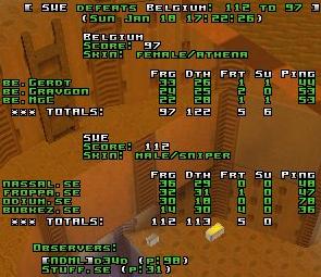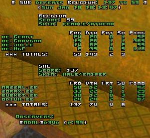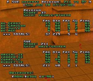 The chosen server was Chef's. Both teams pinged about 50 there so it was an equal choice. By the way, belgians insisted on playing on tourney server so they got it. Sweden picked their best map dm1 and dm7, Belgium's choice wasn't any surprise either - dm2 and dm5.