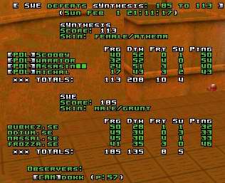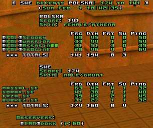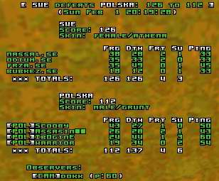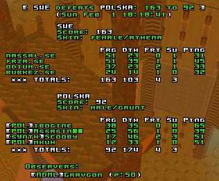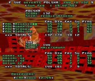 This q2dm3 was very rail based, once a team had the rail secured, you could see their score increasing of 10 frags in a very short time until it switched to the other team. Finally Sweden had the upper hand and secured their 15 frags advantage to win.