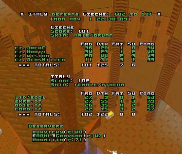 Czech Republic kept the lead until the last 2 minutes, Italy got back the control of the MH and they extended it to the Lift. Czechs were gathering in the water but they weren't living long there because of the chaingun assaults of Italy. The last two minutes, Italy started to collect a lot of frags in the arena (Odie mainly) and they got a 10 frag lead... which melted again in the few last seconds, luckily for them they won though.