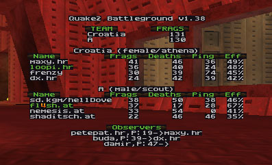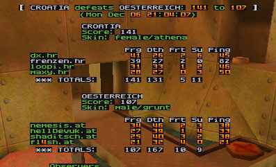 Well again a better start from cro, got the invul ect. made some distance, and took first few quads, invuls ect.. Then Austrians fought back and got in the little lead, got rail control for alot of the match. It was close until the end, so close it went to OT. I have to say almost all Cro players were cornered in the OT , their death was near !!! but then nemesis managed to drop in the lava. So cro win by 1 frag ;) gg.