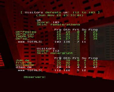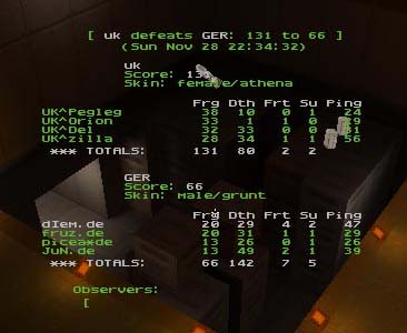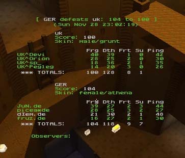 Dm8 was a nice map for UK who managed to get most Power-ups and hold HB for almost all of the game, the rail was tehn keenly fought over between the Germans and UK players who often found themselves out-numbered here, in the end though superior tactics came through and even though it was close tostart with UK ran out deserved winners.