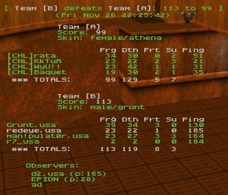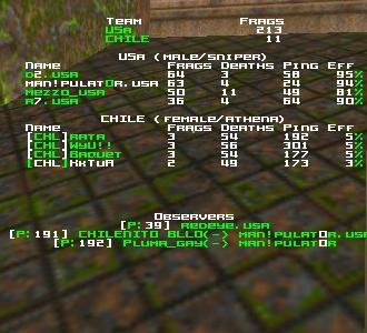 In the beginning USA got a big lead, but Chile using their a lot better pings, managed to catch up to 20 frags. Anyway they never crossed that barrier and USA kept the lead till the end.