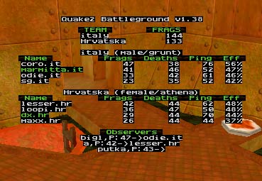 Well italy started better and looked like they will do good on this map. Then Corona i think got confused about invul and waited for it a loooong time :))) almost the whole 5 mins :)) he even took the timeout 2 times cause he asked if its on :) . Well too bad for Italy, they played quarter of the game 3v4. Cro wins ! (gg dx taking most of quads, a lot in front of ita noses)