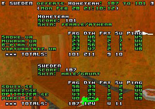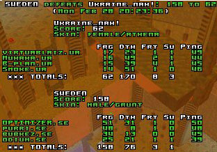 Ukraine focused on the rail and managed to get a quite a few frags from there. Bubkez was ruling on the lift, which Ukraine had seemed to forget about. After a while purri got control over the railguns and shared those with his mates. The classic dm1 lockdown began and Ukraine didn't stand a chance anymore. Several minutes passed by with Ukraine not getting a single frag. After 20 minutes Sweden got a 110