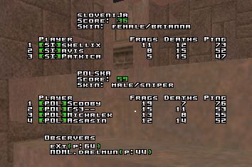 Now, this was a weird game to admin. You know, when you come into a channel as a ref, and everything is done before you show up, you know something is going to go wrong. The point was that Slovenia had been waiting for a while for Poland to get their 4 players on, and in the meantime the server was already chosen, and the maps were decided. So, all there was to do, was to wait. And the best waiter award amongst the Slovenian players gotta go to Avis, cause he is so cool and has such good looks etc. Yeah, anyway, we waited and waited. Assasin was probably working quite hard on findng that 3rd and 4th player, but somehow, like a rabbit in a hat, there came Cs3 and Scooby out of nowhere! Already delayed by x amount of minutes, everyone was eager to get the game going. Even Avis. It was quite obvious that the Polish team came into this game a bit unprepared, it wasn't cause of hours upon hours of strategical meetings they were delayed, obviously.