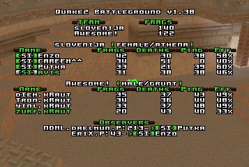 As happy as I was to not doing anything today, Gravgon was in deep need of an admin to admin the game Slovenia vs Germany, so I stepped up to the task. Being an admin is very hard and draining at times, but this game was pretty nice actually. Mostly cause I've never experienced any trouble with either of the teams, the Germans are always very nice and professional (at least that one previous game I adminned them), and the Slovenians are a fairly happy bunch of quakers as well who speaks a language noone really understands. Good thing they do their whining in that unkown language so the rest of us don't need to bother all that much :)) Anyway, what did I have to do infront of the game? Not a whole lot really, was on the server the teams had agreed to play on, but Putka realized it was crap, so he changed it to another. Both servers were in Croatia, so the pings were pretty even. The name of the server was "Awesome q2server", and when reading that name you realize something is bogus. It was a crappy server, as crappy as they come. Me, being the admin, had about 200 ping or so, and everyone knows the ping of the admin is of prime importance. Being the brave admin that I am, I agreed to admin under these horrible conditions. Anyway, the teams had fairly even pings, Slovenia abuot 35-40 and germany about 40-50. And an equal amount of pl, allthough Careem seemed to be having quite some trouble with it. But, it was only careem so noone really cared :P