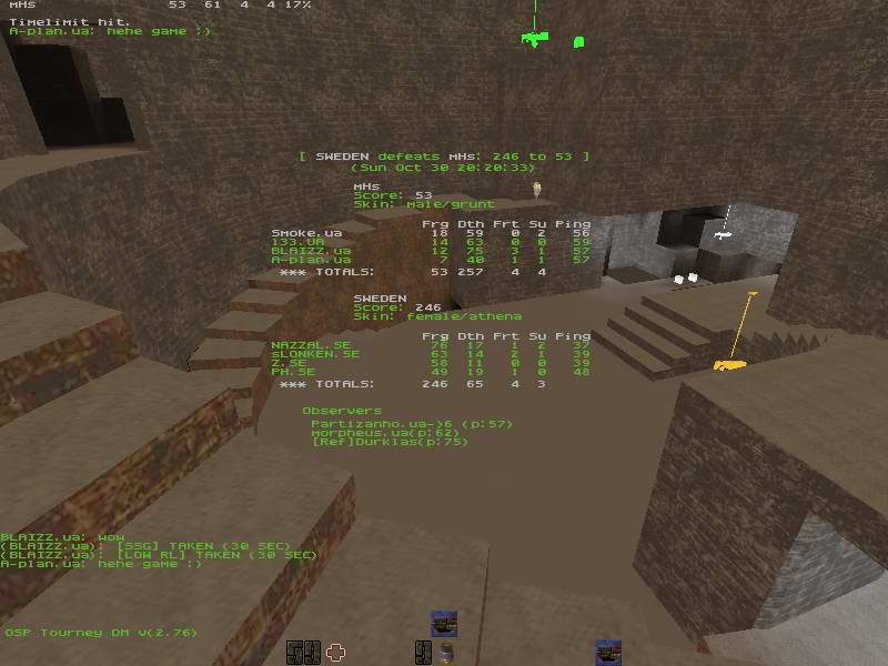 HAHA joke of a day zbone =]]] We know all that u are cheating and about dm1 53 frags? Yes indeed with blaster u cant do more then 53 frags with cheats on vs sweden. =]
