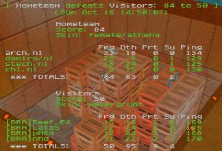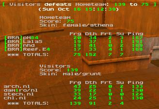 gets a hold of the Powershield in the first minutes but can't make it out of the Alcove as he gets rocketed. After 5mins, Brazilians seems to establish a certain control of the Rail area, and they pull out some good railing even though a 170ping. Brazil momentarily takes the lead, However the Netherlands have good timing and get most of the powerups, soon Arch gets a powershield as well as dam1ro sitting at hyperblaster, the team gets green, and force in the Rail area, yet Brazil stand ground and gives a great fight. The area is retaken a few minutes after the powershield control, but the Netherlands don't seem to rack up frags, and the brazilians still follow their opponent closely scorewise. After 15mins the frag difference is of only 15, however the Netherlands have powershields and their span of life is greatly increased. They will keep control of the Rail area and slowly increase the lead to finally pull out a well-deserved win, thanks to the Powershields.