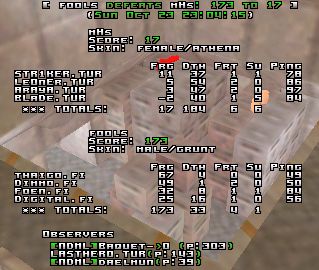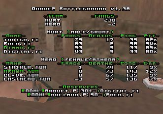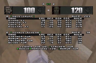 Hehe, now this was an intresting game! Clearly the Finland team suffered from a pretty bad ping (200 at average, but Foen had 280 while dimmo had around 130), but boy did they put up a fight! I must say all respect to Foen for his play on that ping, showing that good teamplay can make up for some of that ping. Thaigo as well showed great play at times, took a while to get used to the ping, but he ran around below the RA with rail and fragged quite a few. Even a had a very nice air handgrenade on Foen by RA, but on that ping every teamkill is forgiven. Teamkills, now that was something the FIN team did a lot, they fragged eachother almost as much as the other team at times. Anyway, the RA was never held for long by either team, a lot of takeovers, some fancy ala Dimmo's nadejumping to RA, or others just accidentally when somehow the RA was empty and free for anyone to take. By quad, the battle was just as hard. Dimmo and Str1ker being the main players in this area, both hugging the quad and both having quite a few successfull quadruns. Not sure what team who got the most quads, but think it was pretty even. Dimmo as always playing in his own style, trying things that only Dimmo does. Str1ker played really solid, proved once again to be one of Turkey's best players. Digital had a hard time holding that RL lift, but he did a good job there, and showed nice teamwork the whole map through, allthough his score doesn't give credit to his effort. ArAyA seemed to be hellbent on holding that mega lift (almost ColD style, if you watched the previous game Turkey played on q2dm2, vs Russia), but he did do a good job holding back enemy quadruns, and wasn't as stationary as the mentioned ColD. LaStHeRo and Blade fought by RA. Anyway, the score was close the whole game through, the first 5 min or so the teams were dead even, then TUR managed to get RA and racked up a few frags, having about 7-10 frags lead for the next 10 minutes, but never more. Then, near the end FIN suddenly managed to rack up some frags, mainly cause Dimmo ran quad very well, and Thaigo/Foen working well on the RA lift. Think a 3 minutes or so near the end, the teams were practically tied, but the last 2 minutes the TUR team just got the quads and had the RA, and managed to squeeze a 20 frag win out of the last couple minutes. It was a close game, and a good watch, even though pings were as unfair as they come.