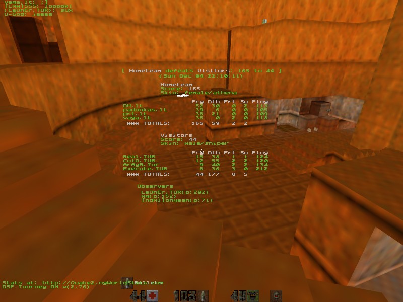 This went the way it should. LTU quickly got the map under control, and it took quite some effort for TUR to get any frags at all. In the end it went a little better for TUR and they ended up with a cool-looking score of "44". DM managed the railway with ping 100+ quite nicely, but Man of the Match award goes to Vaga - 0 deaths! Nice.